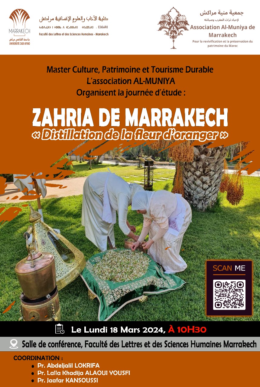 تحت شعار ” زهرية مراكش -تقطير زهرة البرتقال – تنظم جمعية -منية مراكش- يوم الإثنين 18 مارس يوميا دراسيا على الساعة 10h30 بقاعة المحاضرات بكلية الآداب و العلوم الإنسانيةبمراكش