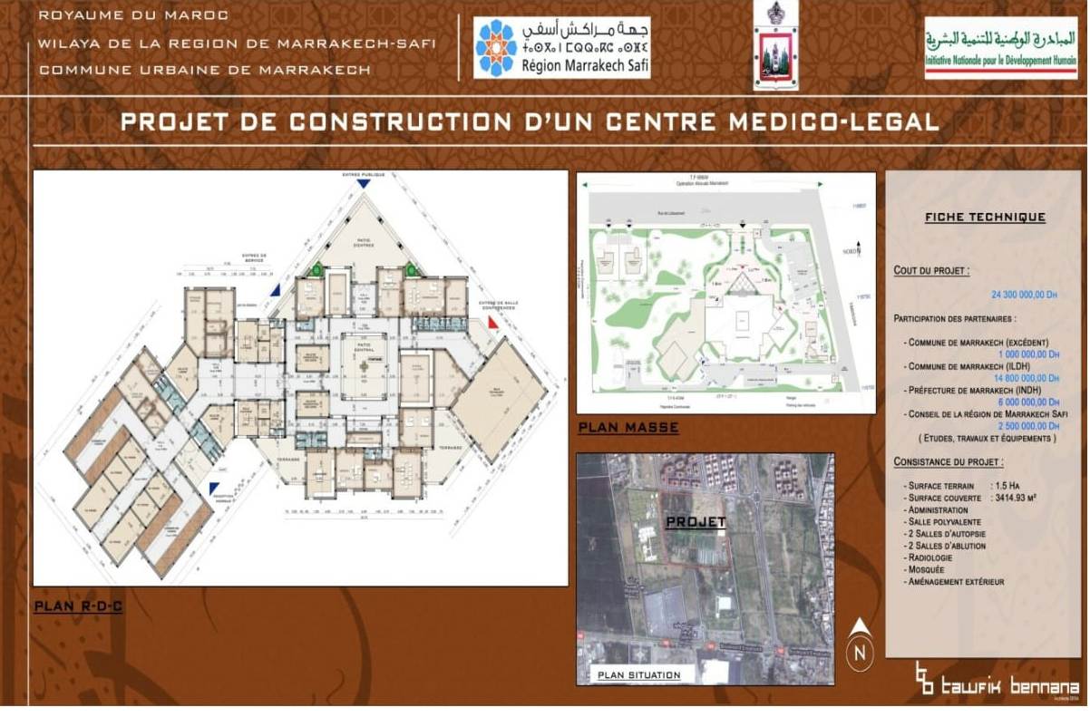 قدم المجلس الجماعي لمراكش أمس الخميس للسادة ممثلي وسائل الإعلام تفاصيل المشاريع الكبرى المنجزة ومن ضمنها مركز الطب الشرعي بمنطقة أبواب مراكش و يمتد على مساحة هكتار ونصف منها 3414 متر مربع مساحة مغطاة ويغطي إحتياجات جهة مراكش أسفي وبإمكانه التجاوب وإستقبال حالات من مناطق اخرى  ويضم قاعتين  للتشريح الطبي بمواصفات علمية حديثة وقاعة كبرى متعددة الإختصاصات وقاعتين لغسل الأموات ومسجدا للصلاة وقاعة حديثة للفحص بالأشعة و 4 مستودعات مجهزة لحفظ الأموات منها 2 تضمن تبريدا بدرجة حرارة تحت الصفر و 2 تضمن درجة حرارة معتدلة  فوق الصفر وقاعة كبرى للإجتماعات والندوات