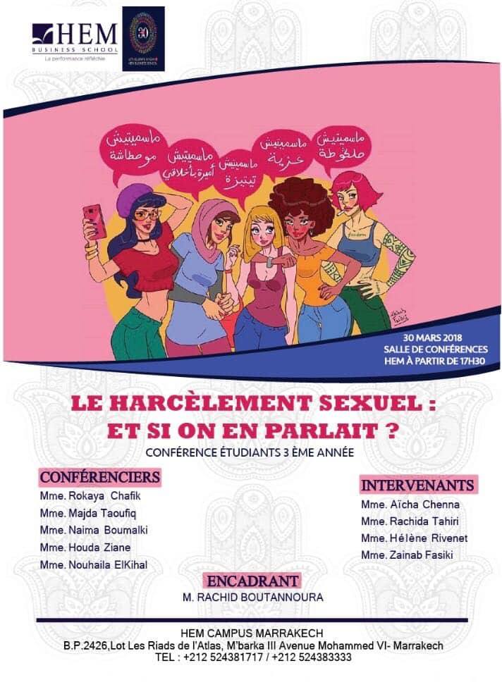 تنظم طالبات السنة الثالثة بمؤسسة الدراسات العليا للتدبير والتسيير HEM بمراكش يومه الجمعة 30مارس على الساعة الخامسة والنصف بعد الزوال بمقر المؤسسة ندوة فكرية لتعميق النقاش حول ظاهرة التحرش الجنسي إنطلاقا من رؤية الطالبات