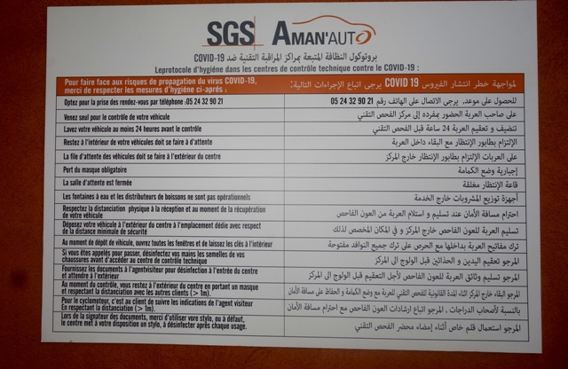و تقضي الإجراءات الصحية الجديدة بأخد موعد مسبق عبر الهاتف و تأكيده حضوريا في مرحلة لاحقة فيما يجب على صاحب السيارة الحضور للمركز بمفرده والقيام بتنظيف و تعقيم العربة 24 ساعة قبل الفحص التقني والإلتزام بالبقاء داخل العربة ومراقبة الشاشة إلى حين ظهور رقم الموعد دون إغفال وضع الكمامة والإنتظار خارج قاعة الفحص مع إحترام مسافة الأمان عند تسليم و إستلام العربة و التقيد بكافة التوصيات المعلنة .