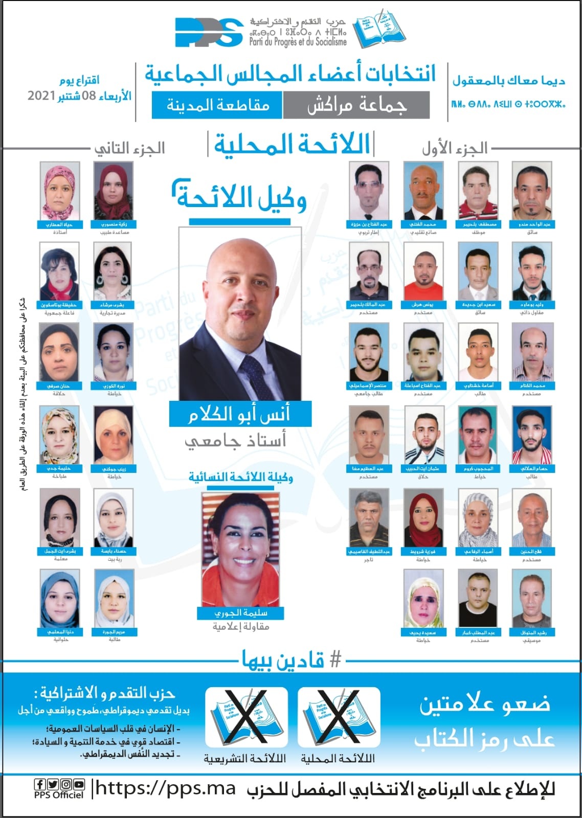 اللائحة التي ستخوض غمار إنتخابات 8 شتنبر بمقاطعة -مراكش المدينة- جاءت على غرار جميع لوائح حزب التقدم والإشتراكية غنية ومتنوعة ويتم إنتقائها بعناية لتمثل جل الشرائح المجتمعية من مستخدمين ، فنانين، ، جمعويين ، طلبة جامعيين ، مقاولين ذاتيين ، صناع تقليديين ، تجار ، موظفين و رجال ونساء التربية، يتقدمهم الأستاذ الجامعي أنس أبو الكلام فيما تتقدم اللائحة النسائية المقاولة في مجال الإعلام سليمة الجوري