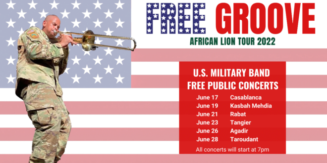 وتقوم الفرقة العسكرية الأمريكية الموسيقية “فري غروف” في الفترة ما بين 17 و 28 يونيو الجاري بجولة في المغرب، وذلك على هامش تمرين الاسد الافريقي 2022، وهي فرقة الجاز الأولى للجيش الأمريكي في أوروبا وإفريقيا وتتكون من جنود موسيقيين تم اختيارهم خصيصا لقدراتهم في الارتجال وأداء الجاز.