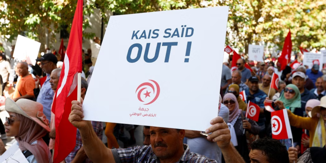 تظاهر  الآلاف من أنصار الأحزاب المعارضة في تونس، اليوم السبت، للتنديد بسياسة الرئيس قيس سعيّد ومطالبته بالرحيل وحمّلوه مسؤولية تدهور الوضع الاقتصادي والاجتماعي في البلاد.