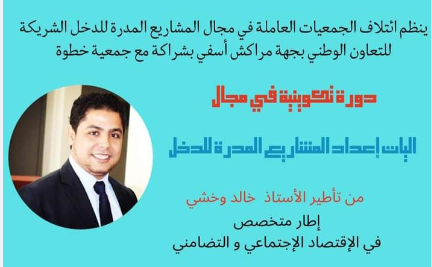 تخليدا لليوم العالمي للمرأة، و ذكرى تأسيس التعاون الوطني، ينظم إئتلاف الجمعيات العاملة في مجال المشاريع المدرة للدخل، الشريكة للتعاون الوطني بجهة مراكش اسفي، بشراكة مع جمعية خطوة، دورة تكوينية في مجال “أليات إعداد المشاريع المدرة للدخل” من تأطير الأستاذ خالد وحشي إطار متخصص في الإقتصاد الإجتماعي و التضامني لفائدة الجمعيات الشريكة للتعاون الوطني و الفاعلين الجمعويين وذلك يوم السبت 18 فبراير 2023 على الساعة العاشرة صباحا بمركز التكوين و التأهيل في حرف الصناعة التقليدية قبور الشهداء