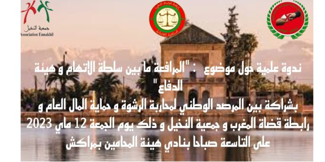 تنظم رابطة قضاة المغرب بشراكة مع -المرصد الوطني لمحاربة الرشوة و حماية المال العام – و جمعية النخيل ندوة علمية تحت عنوان “المرافعة بين سلطة الاتهام و هيئة الدفاع ” و ذلك يوم الجمعة 12 ماي 2023 على الساعة التاسعة صباحا بنادي هيئة المحامين بمراكش