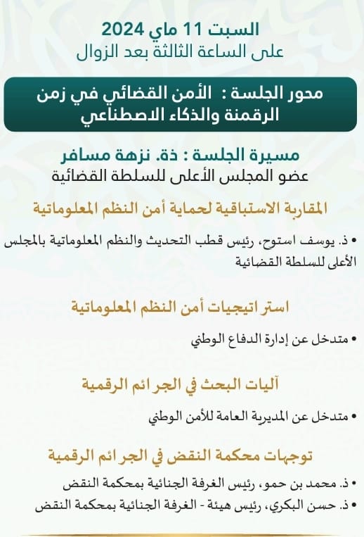 شكل موضوع الأمن القضائي في زمن الرقمنة والذكاء الاصطناعي، محور نقاش بين مسؤولين ومختصين في الندوة التي نظمها المجلس الأعلى للسلطة القضائية، اليوم السبت 11 ماي 2024، في إطار فعاليات الدورة 29 للمعرض الدولي للنشر والكتاب، المنظم بالرباط، تحت الرعاية السامية لصاحب الجلالة الملك محمد السادس نصره الله.