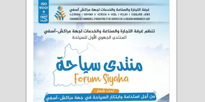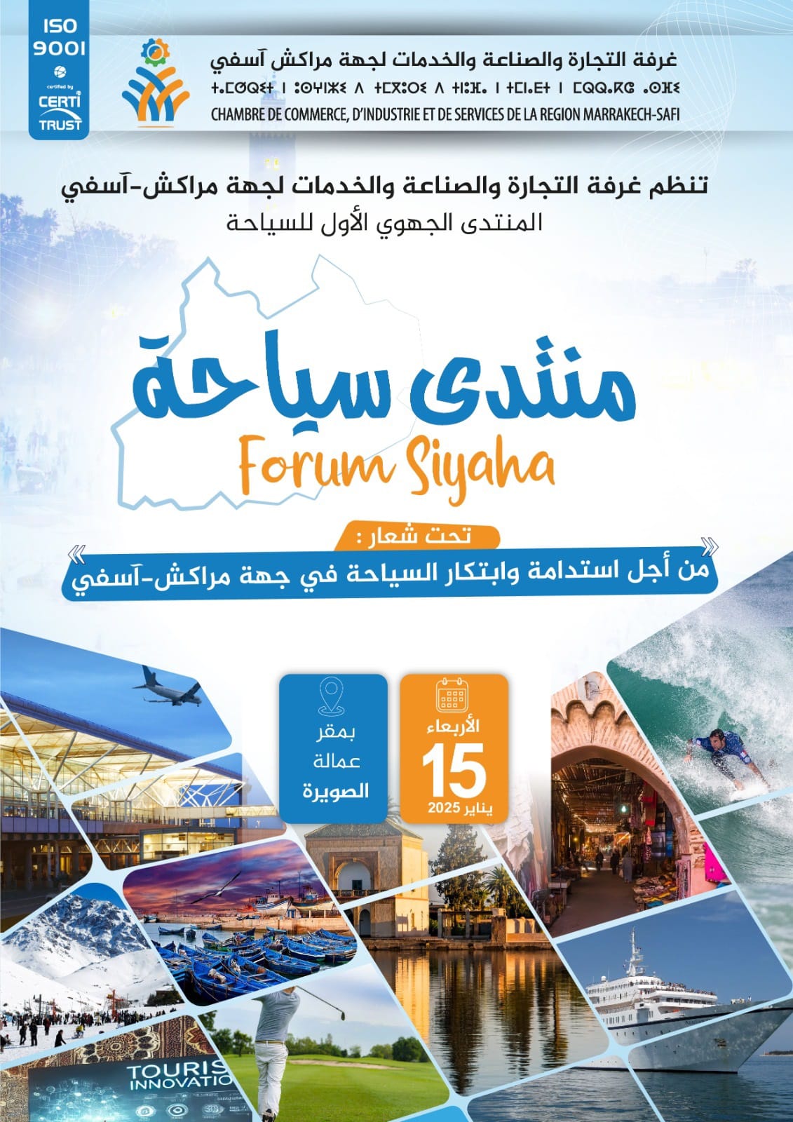 تنظم غرفة التجارة والصناعة والخدمات لجهة مراكش آسفي، النسخة الأولى للمنتدى الجهوي للسياحة تحت شعار” من أجل استدامة وابتكار السياحة بجهة مراكش آسفي“، وذلك يوم الأربعاء 15 يناير 2025 ابتداءا من الساعة التاسعة والنصف صباحا بالقاعة الكبرى بمقر عمالة إقليم الصويرة .