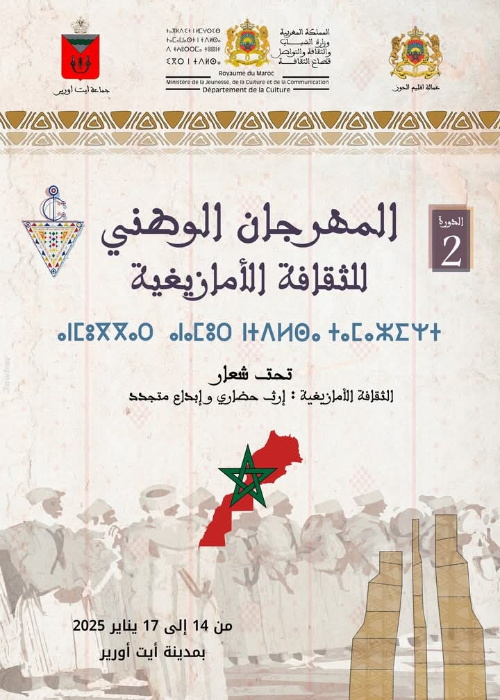 تنظم وزارة الشباب والثقافة والتواصل – قطاع الثقافة، بشراكة مع عمالة إقليم الحوز، المجلس الإقليمي للحوز، والمجلس الجماعي لآيت أورير الدورة الثانية للمهرجان الوطني للثقافة الأمازيغية، تحت شعار: “الثقافة الأمازيغية: إرث حضاري وإبداع متجدد”، وذلك خلال الفترة الممتدة من 14 إلى 17 يناير 2025 بمدينة آيت أورير.