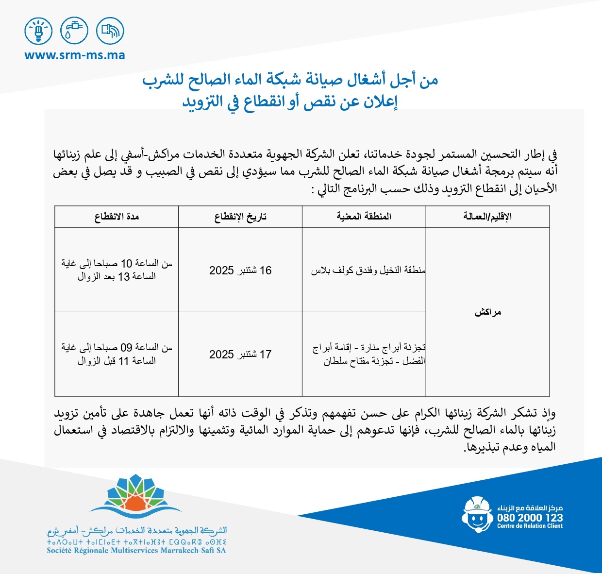 من أجل أشغال الصيانة .. إعلان عن إنقطاع مرتقب في التزويد بالماء الصالح للشرب عن بعض الأحياء هيئة التحرير 15 سبتمبر، 2025 اضف تعليق 2025-09-15 هيئة التحرير شاركها فسبوك تويتر قوقل بلوس LinkedIn