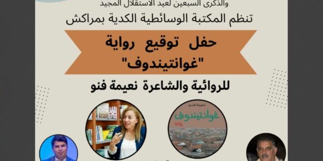 تخليداً للذكرى الخمسين للمسيرة الخضراء المظفرة، واحتفاء بالذكرى السبعين لعيد الاستقلال المجيد، تنظم المكتبة الوسائطية الكدية بمراكش تحت إشراف المديرية الجهوية لوزارة الشباب والثقافة والتواصل -قطاع الثقافة – مراكش أسفي حفل توقيع رواية “غواتيندوف” للروائية والشاعرة نعيمة فنو، وذلك يوم السبت 29 نونبر 2025 على الساعة الخامسة مساءً بقاعة الندوات بالمكتبة.
