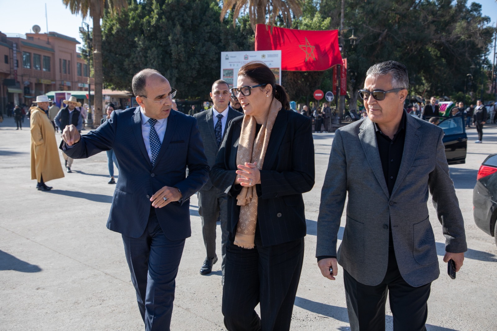وبعد ذلك، توجهت السيدة العمدة إلى ساحة جامع الفنا التاريخية، حيث قامت بزيارة ميدانية للوقوف على سير الأشغال ومستوى تقدمها واحترامها للمعايير التقنية المعتمدة.