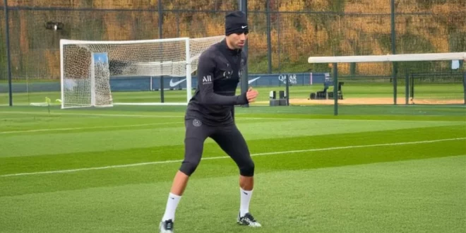 وتظهر الصور، التي تعود ليوم الخميس، حكيمي، المتوج حديثا بالكرة الذهبية الإفريقية، وهو يجري تمارين الجري على هامش حصة تدريبية جماعية لزملائه في باريس سان جرمان.