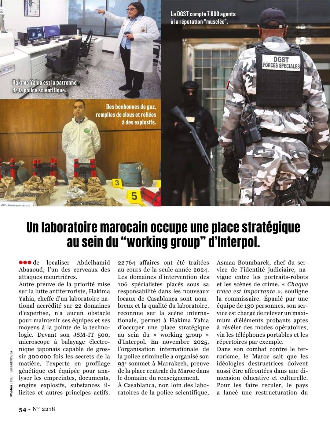 كما خصّص التقرير حيّزاً مهماً للشرطة العلمية والتقنية المغربية، مبرزاً أن مختبراً مغربياً يحتل اليوم موقعاً استراتيجياً داخل “working group” التابع لـ الإنتربول. وأشار إلى أن هذا المختبر، المعتمد دولياً، يتوفر على تجهيزات متقدمة في مجالات البصمة الوراثية، وتحليل المتفجرات، وتتبع الأدلة الرقمية، ما جعل المغرب شريكاً موثوقاً في التحقيقات العابرة للحدود.