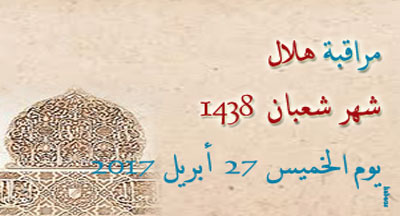 أعلنت وزارة الأوقاف والشؤون الإسلامية إلى أصحاب الفضيلة السادة القضاة ونظار الأوقاف ومندوبي الشؤون الإسلامية بالمملكة أن مراقبة هلال شهر شعبان ستكون يوم الخميس 29 رجب 1438 موافق 27 أبريل 2017 م.