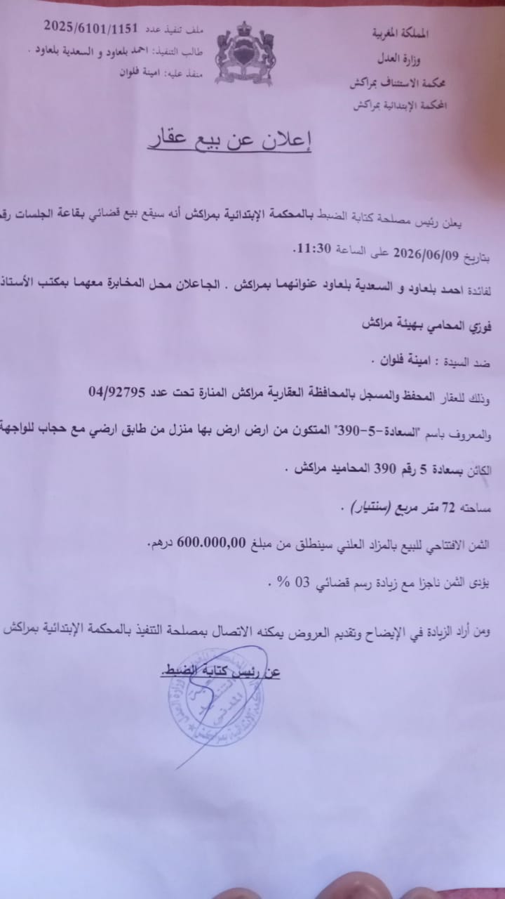 يعلن رئيس مصلحة كتابة الضبط بالمحكمة الابتدائية بمراكش، أنه سيقع بيع قضائي بقاعة الجلسات رقم 4 بتاريخ 09/06/2026 على الساعة 11:30 صباحاً.