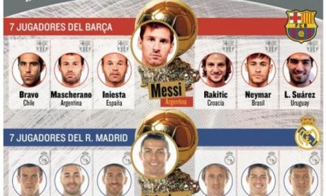 وكشفت صحيفة “موندو ديبورتيفو” لائحة الـ59 لاعبا. وتضم اللائحة 7 لاعبين من ريال مدريد، و7 آخرين من برشلونة، ويأتي بايرن ميونيخ مع 5 لاعبين، ثم يوفنتوس مع 6 لاعبين؛ ولكن 3 منهم غادروا الفريق (بيرلو وفيدال وتيفيز).