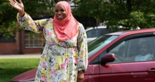 تقف امرأة ترتدي حجابا زهري اللون، في مشهد غير مألوف وسط الطريق في ماساتشوستس، لتلوح للسيار...