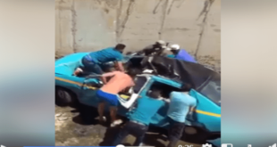 لحظة اخراج سائق سيارة الأجرة الصغيرة التي تعرضت لحادثة سير خطيرة ثلاثية (ثلاثة سيارات) بمد...